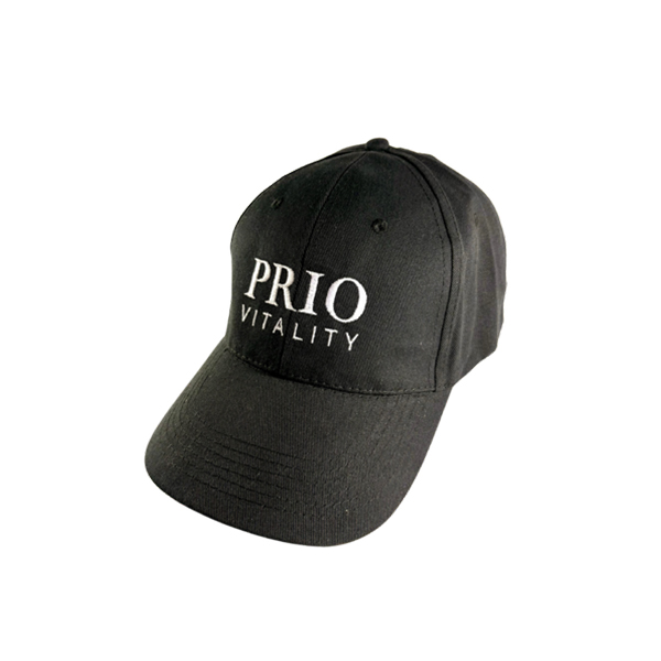Prio Vitality’s snygga keps är av bomull. Svart med vit text i pannan.
